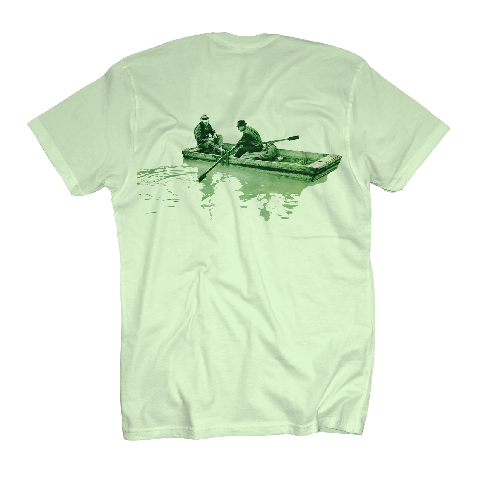 Here is the shirt you have been waiting for! The Flood Album Cover shirt slyly takes advantage of the rare 100% cotton, pistachio-colored t-shirt, and realizes an “all-over” design without all that all-over ink.